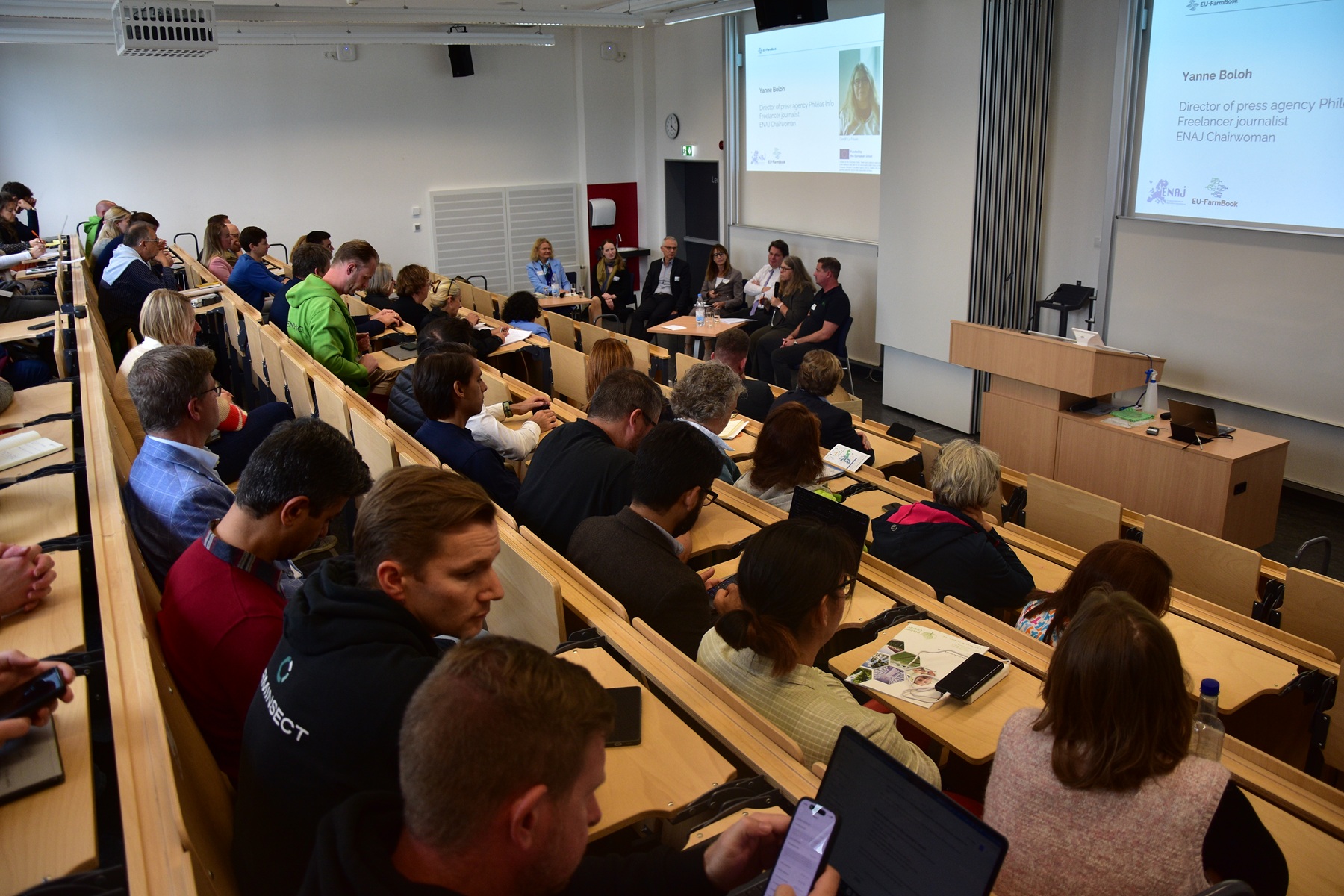 The event was organised by the EU-FarmBook project, the European Network of Agricultural Journalists ENAJ and the Faculty of Agricultural, Nutritional and Engineering Science AEl at the University of Bonn. Around 60 guests from science, business and journalism were welcomed by Professor Dr. Niklas Möhring, Vice Dean for Research and Career Development of the Faculty AEl of the University of Bonn, Prof. Dr. Pieter Spanoghe from the Department Plants and Crops of Ghent University and Yanne Boloh, Director of press agency Philéas Info, journalist and chairwoman of the European Network of Agricultural Journalists ENAJ.